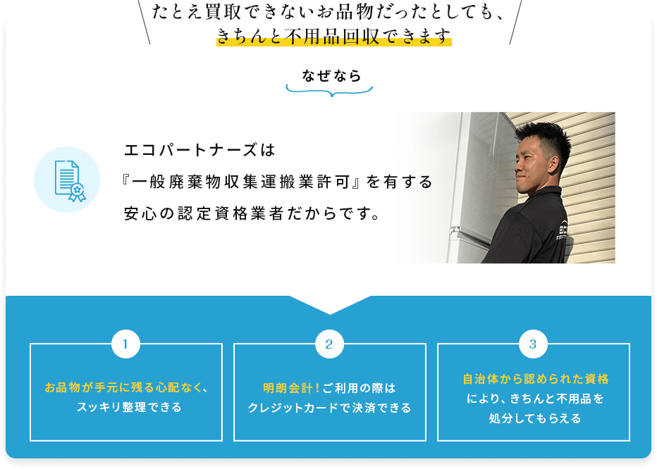 エコパートナーズは買取事業をメインに置きながら、一般廃棄物収集運搬業許可の資格も保有しておりますので不用品回収にもご対応可能です。