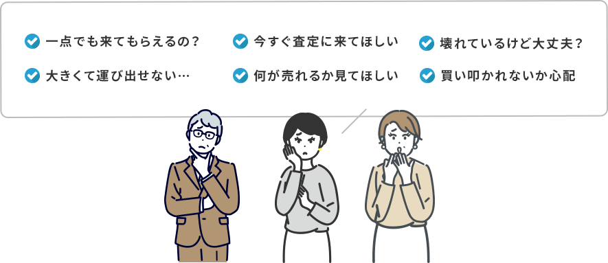 近年、不用品回収は無資格で運営されている会社がかなり多くなっておりますので会社選びは慎重に!弊社の強みとしましては細かい小物などの一点の査定からお家一軒丸々まで幅広いご対応が可能です。